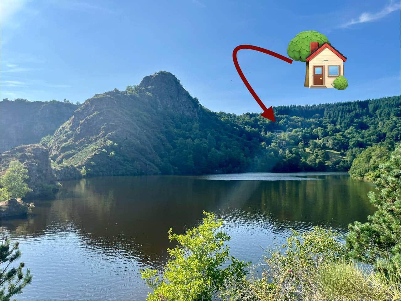 Vue panoramique exceptionnelle sur le Lac et les Gorges de la Truyère depuis une île accessible en kayak (10 min depuis notre ponton) où il est possible de bivouacer pour les plus agurérris ! Le hameau et la Maison Loulie est en haut à droite